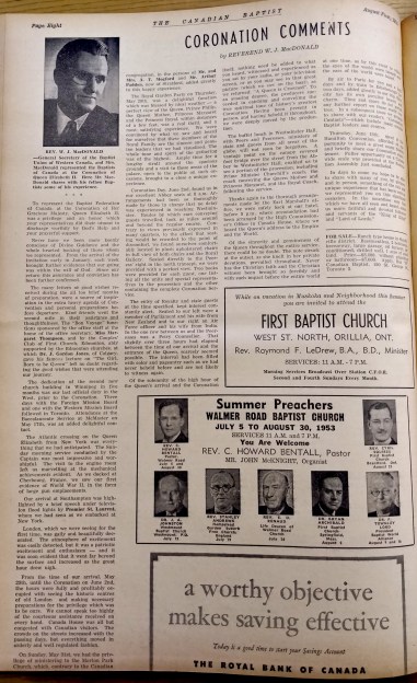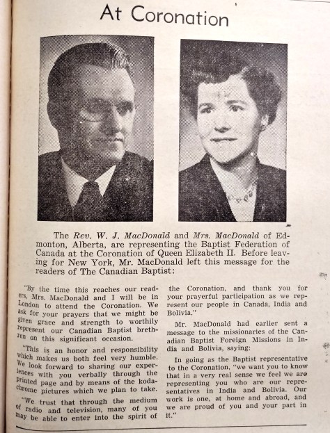 The Baptist Federation appointed two representatives to attend the Coronation, and the Rev. W. J. MacDonald and his wife (name not mentioned) attended and reported on the festivities. (To read MacDonald’s report, click here.)