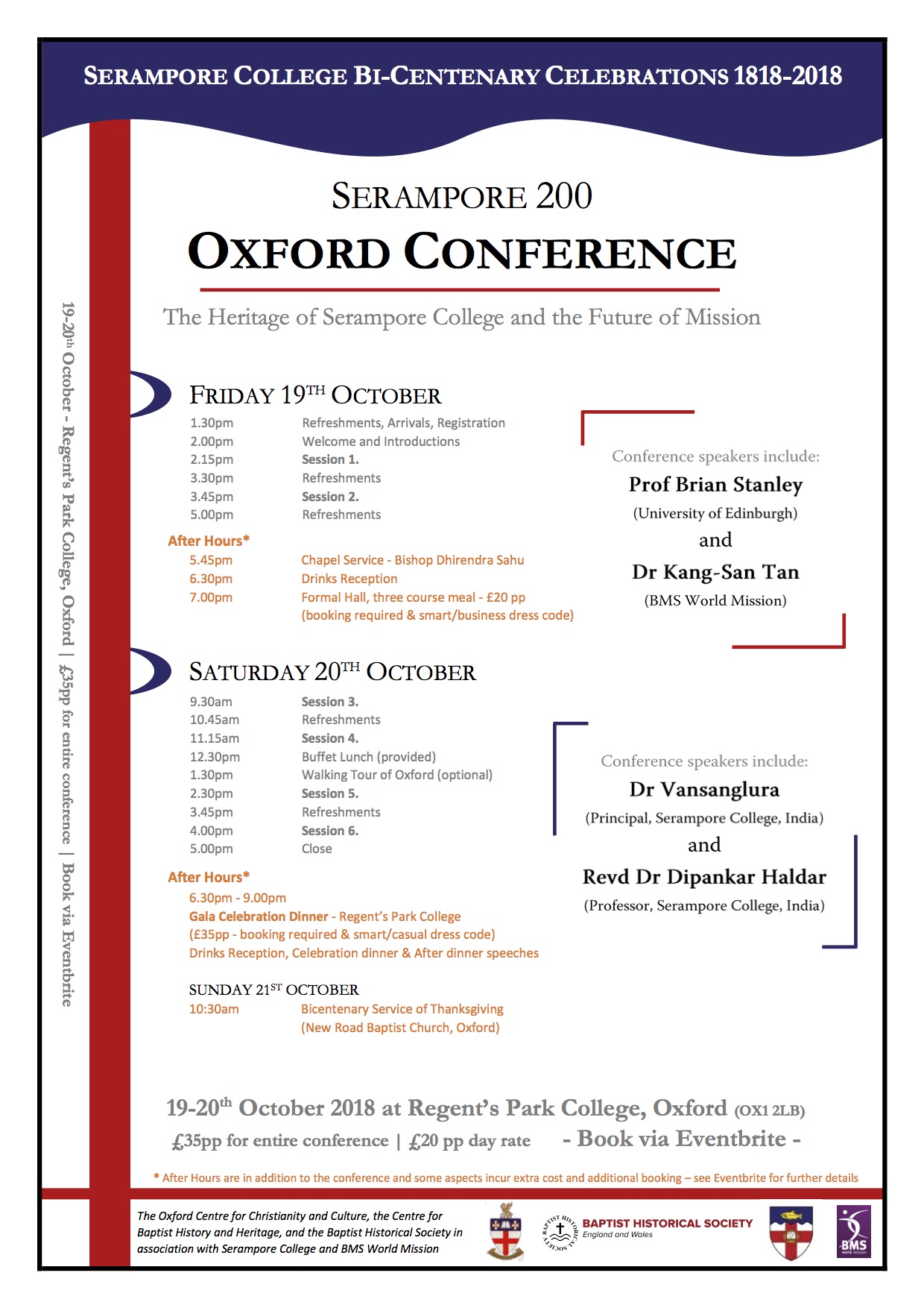 This important and historic conference is jointly organized by: The Centre for Baptist History and Heritage, the Baptist Historical Society, the Oxford Centre for Christianity and Culture and the Baptist Missionary Society.