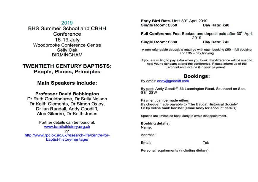 Baptist Historical Society Summer School and annual conference of the Centre for Baptist History and Heritage.