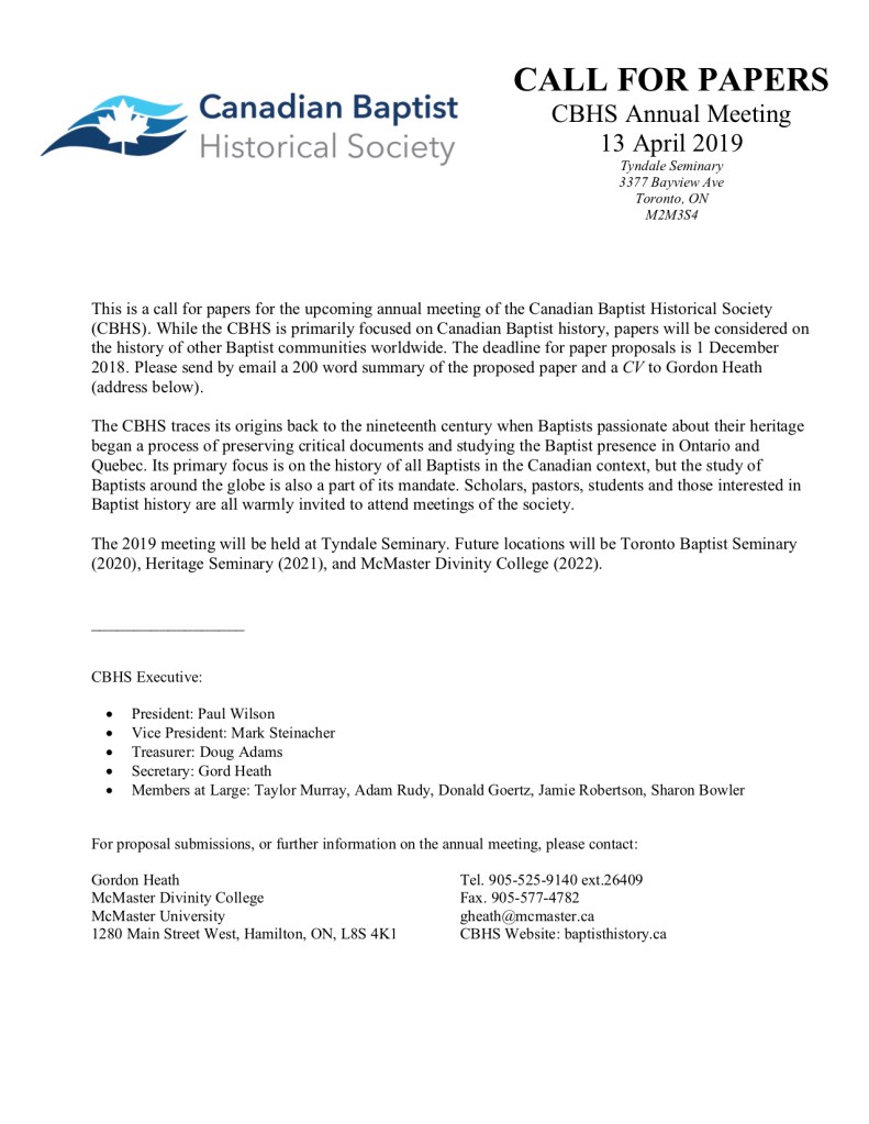 This is a call for papers for the upcoming annual meeting of the Canadian Baptist Historical Society (CBHS).