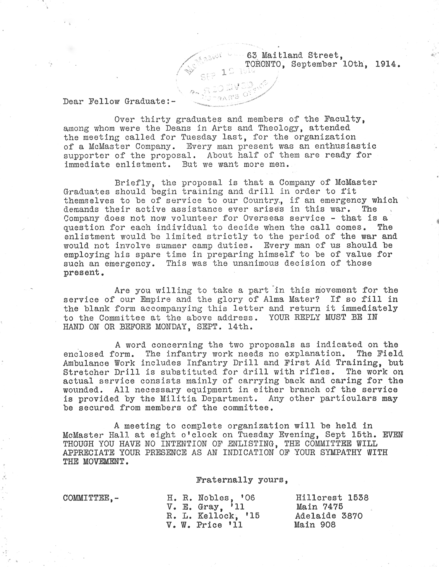 Eager to support the cause, McMaster students and alumni discussed how they could “do their bit.” Among the several responses was the formation of the McMaster University Civilian Rifle Association and plans to form an ambulance section of the Royal Army Medical Corps.3 The first “McMasterite,” however, to formally show his support of the war effort, was Rev. J. B. Grimshaw, a theological graduate of McMaster’s class of 1893. He went overseas with the first Canadian contingent as a chaplain.4