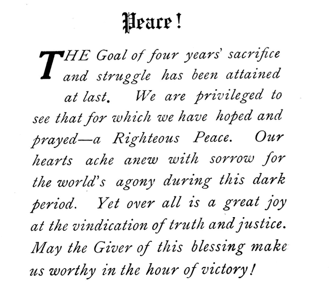 Peace! The goal of four year’s sacrifice and struggle has been attained at last. We are privileged to see that for which we have hoped and prayed–a Righteous Peace. Our hearts ache anew with sorrow for the world’s agony during this dark period. Yet over all is a great joy at the vindication of truth and justice. May the Giver of this blessing make us worthy in the hour of victory!5