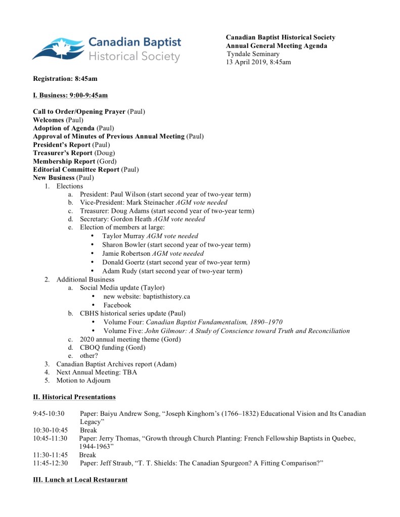 On Saturday, 13 April 2019, the members of the Canadian Baptist Historical Society are gathering for our Annual General Meeting. Below is the agenda.