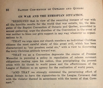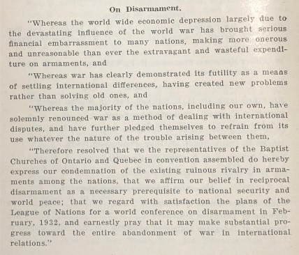 For much of the late 1920s and most of the 1930s the clarion call was for peace. Even various Baptist conventions across Canada made resolutions espousing some form of pacifism.