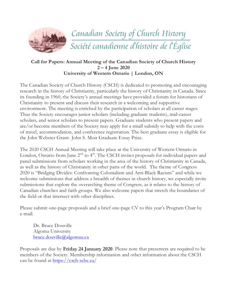 The CSCH invites proposals for individual papers and panel submissions from scholars working in the area of the history of Christianity in Canada, as well as the history of Christianity in other parts of the world. The theme of Congress 2020 is “Bridging Divides: Confronting Colonialism and Anti-Black Racism” and while we welcome submissions that address a breadth of themes in church history, we especially invite submissions that explore the overarching theme of Congress, as it relates to the history of Canadian churches and faith groups. We also welcome papers that stretch the boundaries of the field or that intersect with other disciplines.