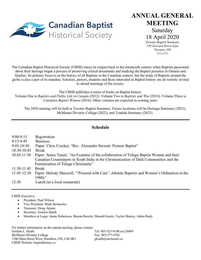 Each April we gather for our Annual General Meeting. In 2020 we are meeting at Toronto Baptist Seminary.