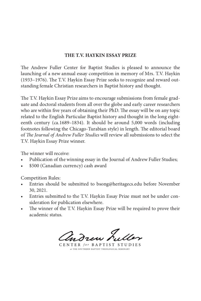 NEWS | Announcing the T. V. Haykin Essay Prize from the Andrew Fuller Center for Baptist Studies Posted on February 17, 2021 by canadianbaptisthistoricalsociety From our friends at the Andrew Fuller Center for Baptist Studies: Share this: Click to share on X (Opens in new window) X Click to share on Facebook (Opens in new window) Facebook Like Loading... Related