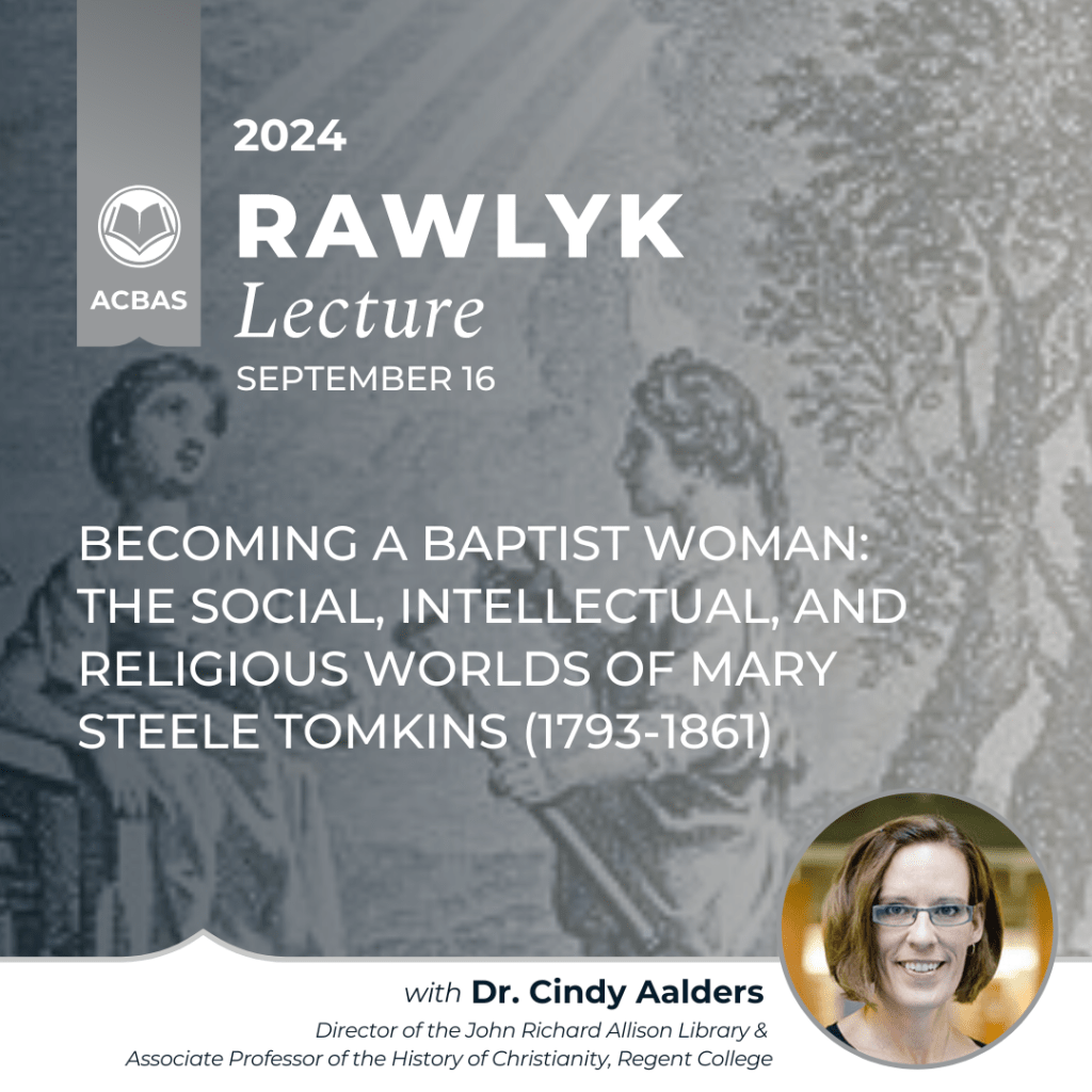 Please join us at 7 PM ADT on Monday, September 16, for the Rawlyk Lecture. Dr. Cindy Aalders from Regent College will speak on “Becoming a Baptist Woman: The Social, Intellectual, and Religious Worlds of Mary Steele Tomkins (1793-1861).”