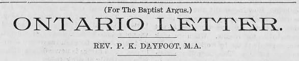 - All quotes from this letter in this blog are from P. K. Dayfoot, “Ontario Letter,” The Baptist Argus, 3 March 1904, 1. ↩︎